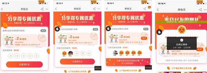 那么BCD呢,他们也有劵吗?也有,只不过是你所设置的子劵,也就是被分享者劵,一般来说子劵会比父劵金额少一些(打个比方是100-10),如果BCD在看到A所获取到的父劵之后,发现还有大额的父劵是可以去领的,那么他们就可能会再次发起一次分享。
